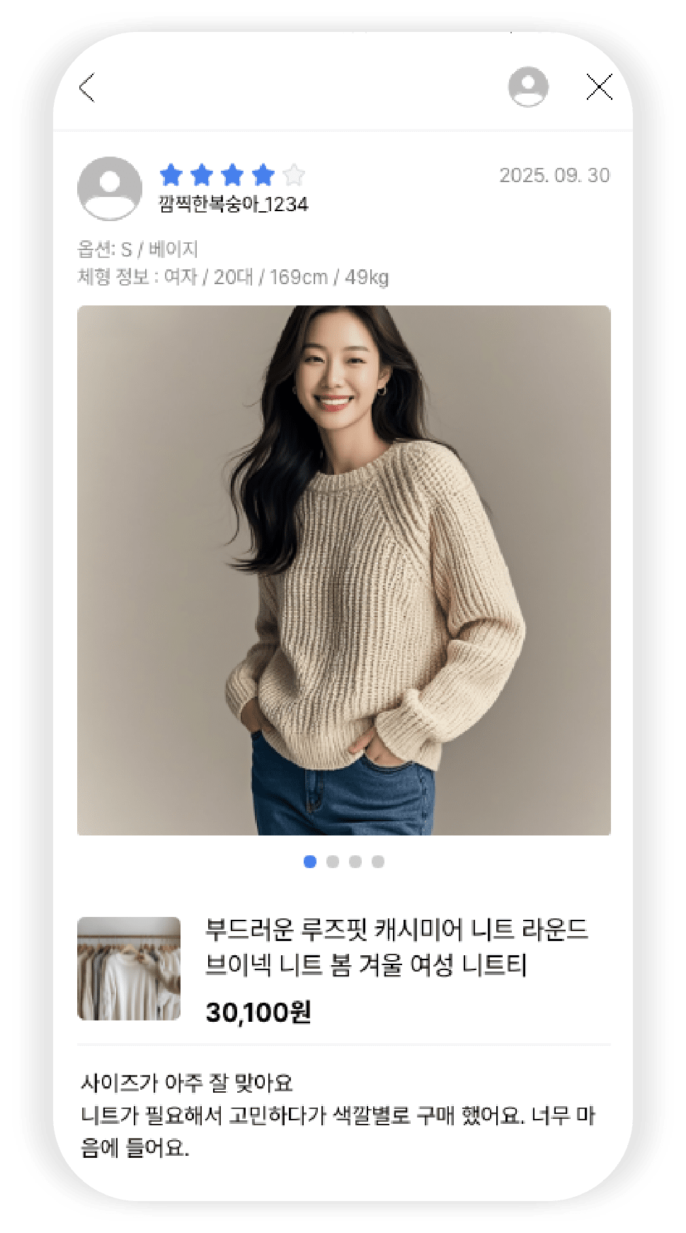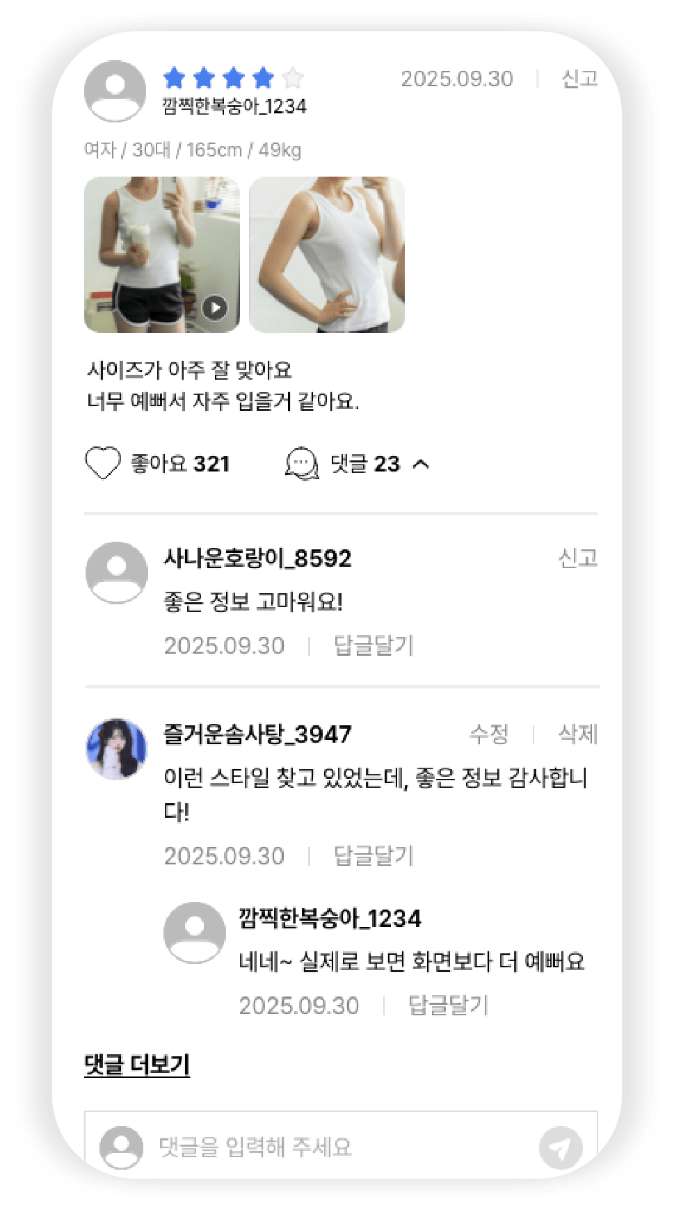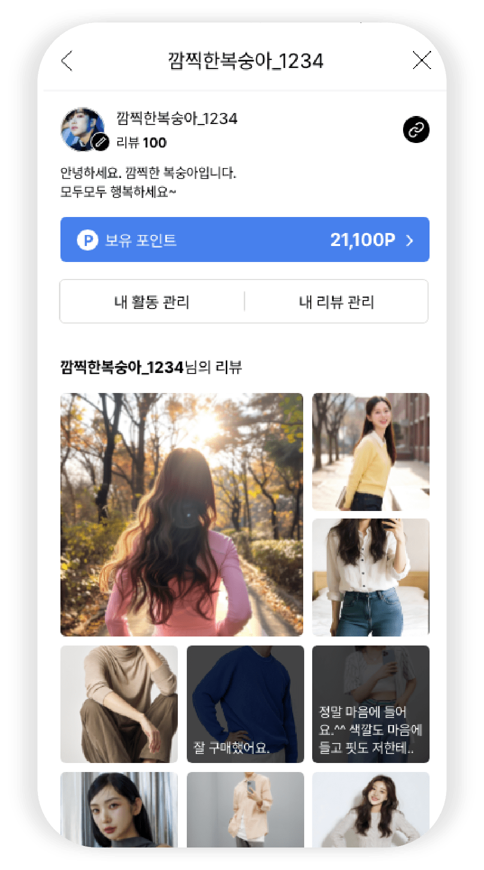 | 리뷰 작성 | 리뷰 콘텐츠, 이미지, 구매 정보(쇼핑몰 연동 시) |